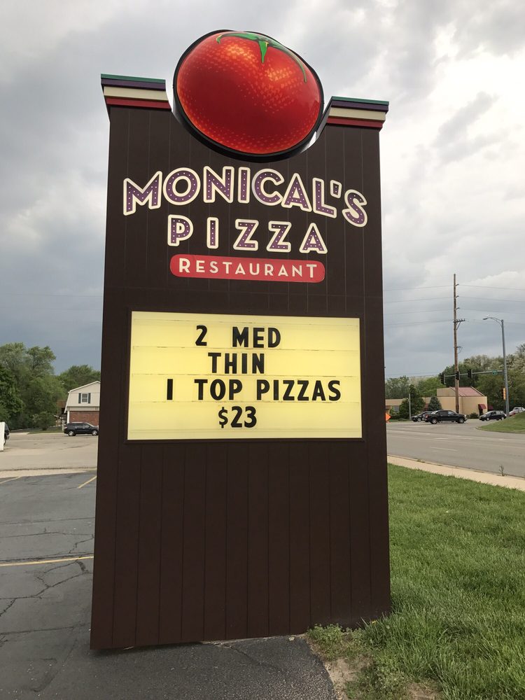 The convenience of Frozen with Monical's Famous Flavor. Choose from Cheese, Sausage or Pepperoni. Take one home on your next visit or, add one on to your next Carry Out or Delivery Order!